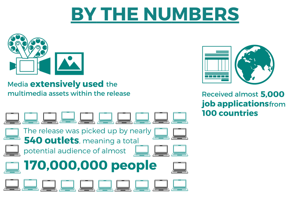 Huge Reach to Earned Media and Their Audiences: Little more than a month after the campaign was launched, the release was picked up by nearly 540 outlets, meaning a total potential audience of nearly 170,000,000 people.